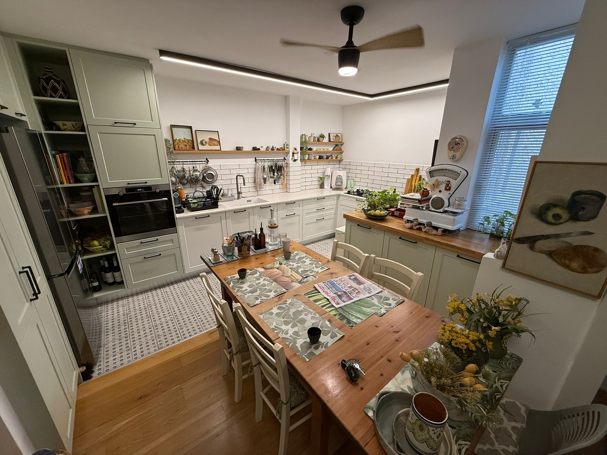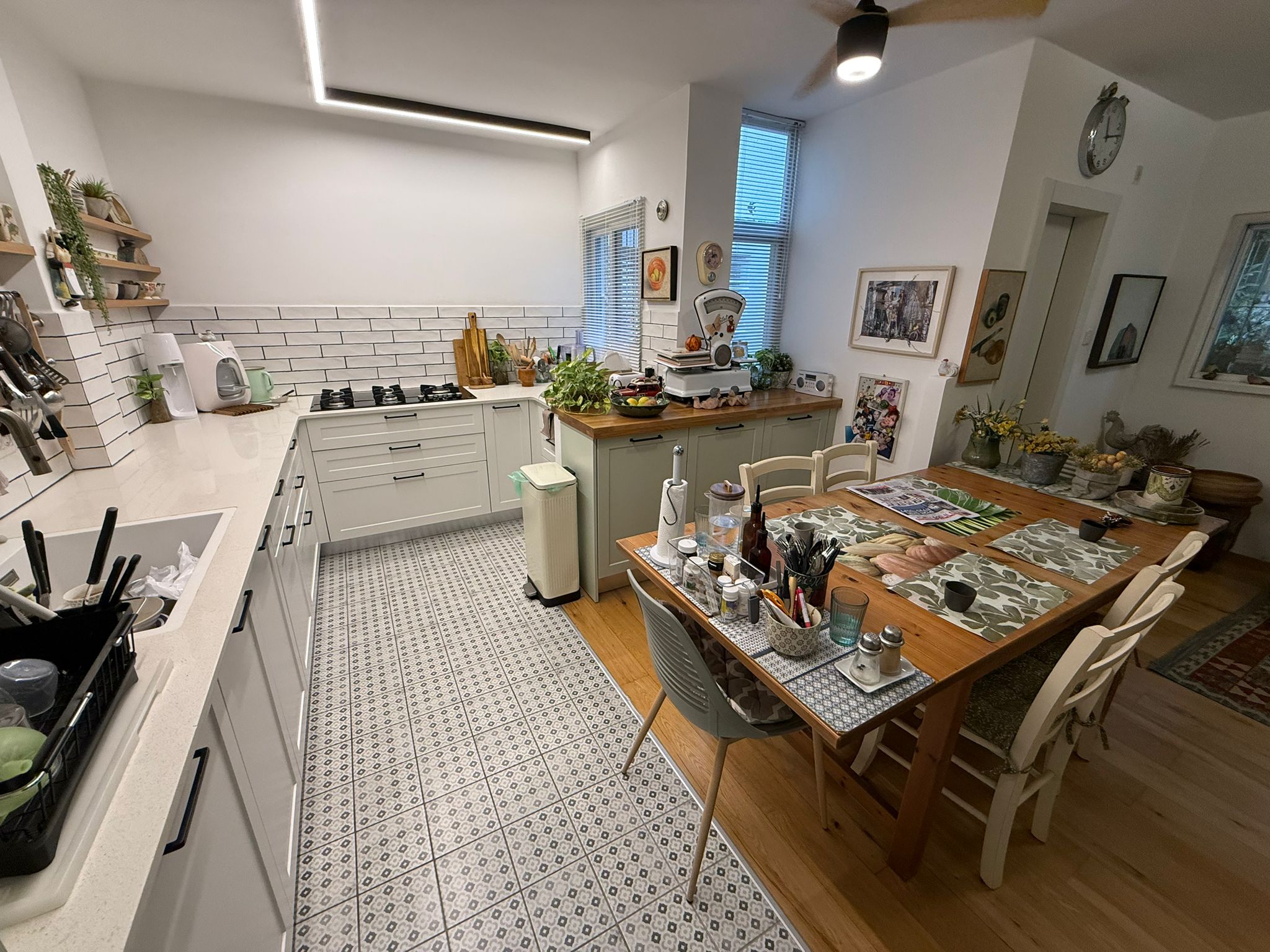 מטבח + פינת אוכל +שירותי אורחים + סלון ויציאה לגינה